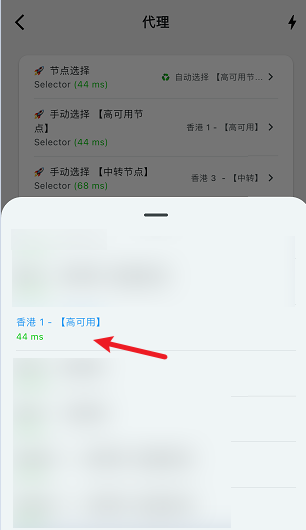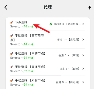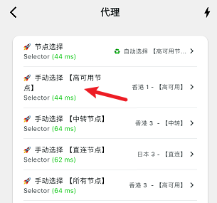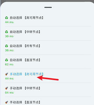 选择自动选择 【高可用节点】之后软件将根据所有【高可用节点】选择延迟最低的作为节点使用,其他自动选择 【XX节点】效果类似。 如果想要固定使用某节点,需要先在节点选择中选择手动选择 【XX节点】