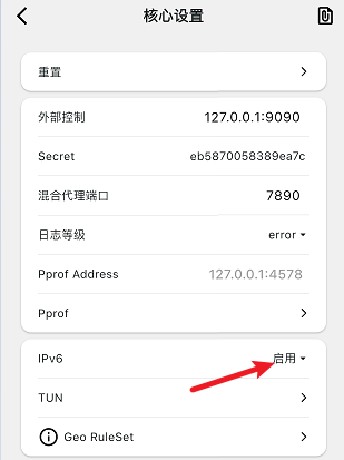 返回主界面,点击核心设置卡片,然后将IPv6参数更改为启用【关键设置】