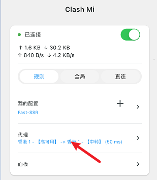 做完上述步骤之后就可以正常使用了,节点选择默认选择自动选择 【高可用节点】。 如果需要切换节点,请点击代理卡片