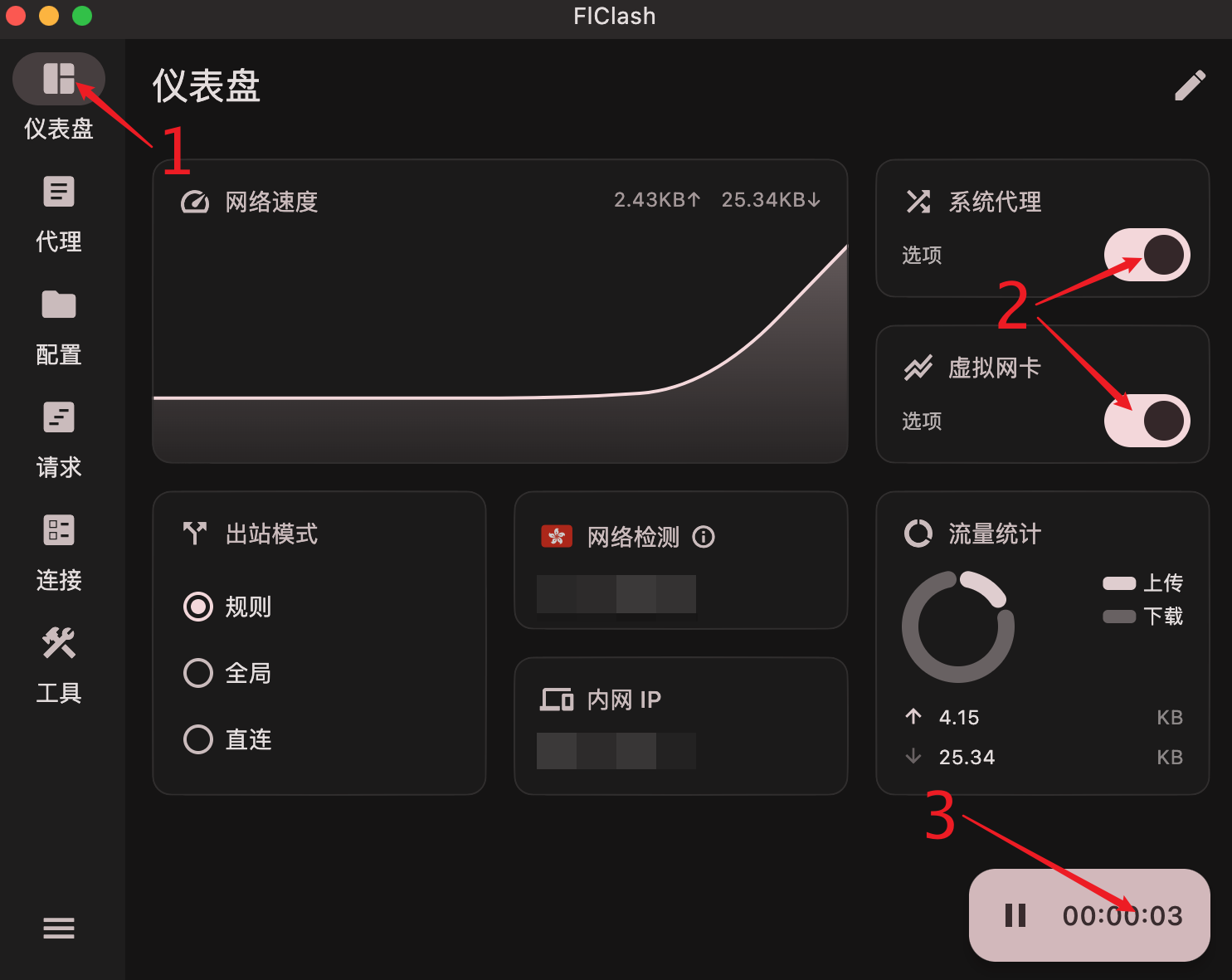 返回仪表盘,开启系统代理和虚拟网卡并点击右下角的启动按钮