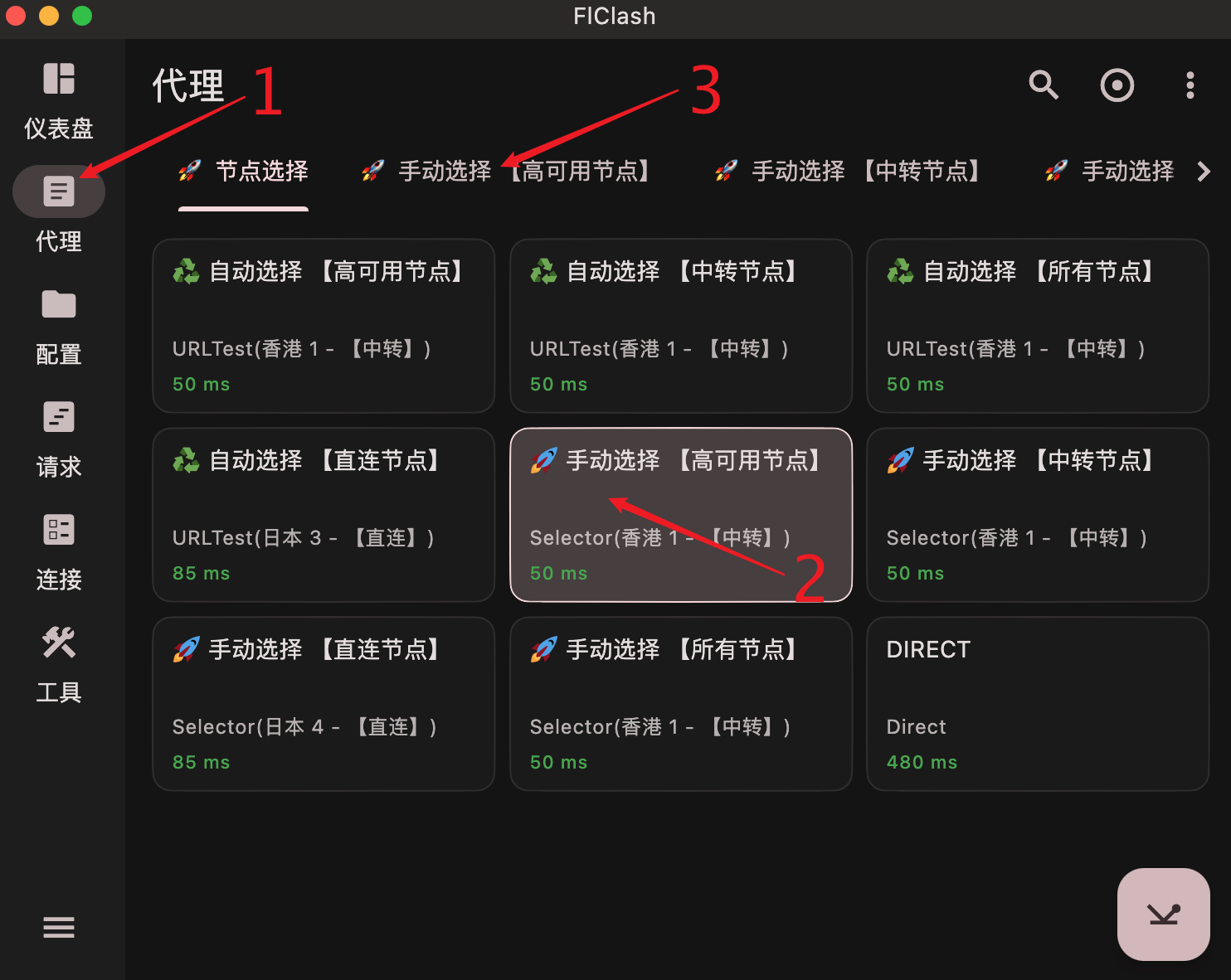 如果想要固定使用某节点,需要先在节点选择中选择手动选择 【XX节点】, 这里以手动选择 【高可用节点】为例