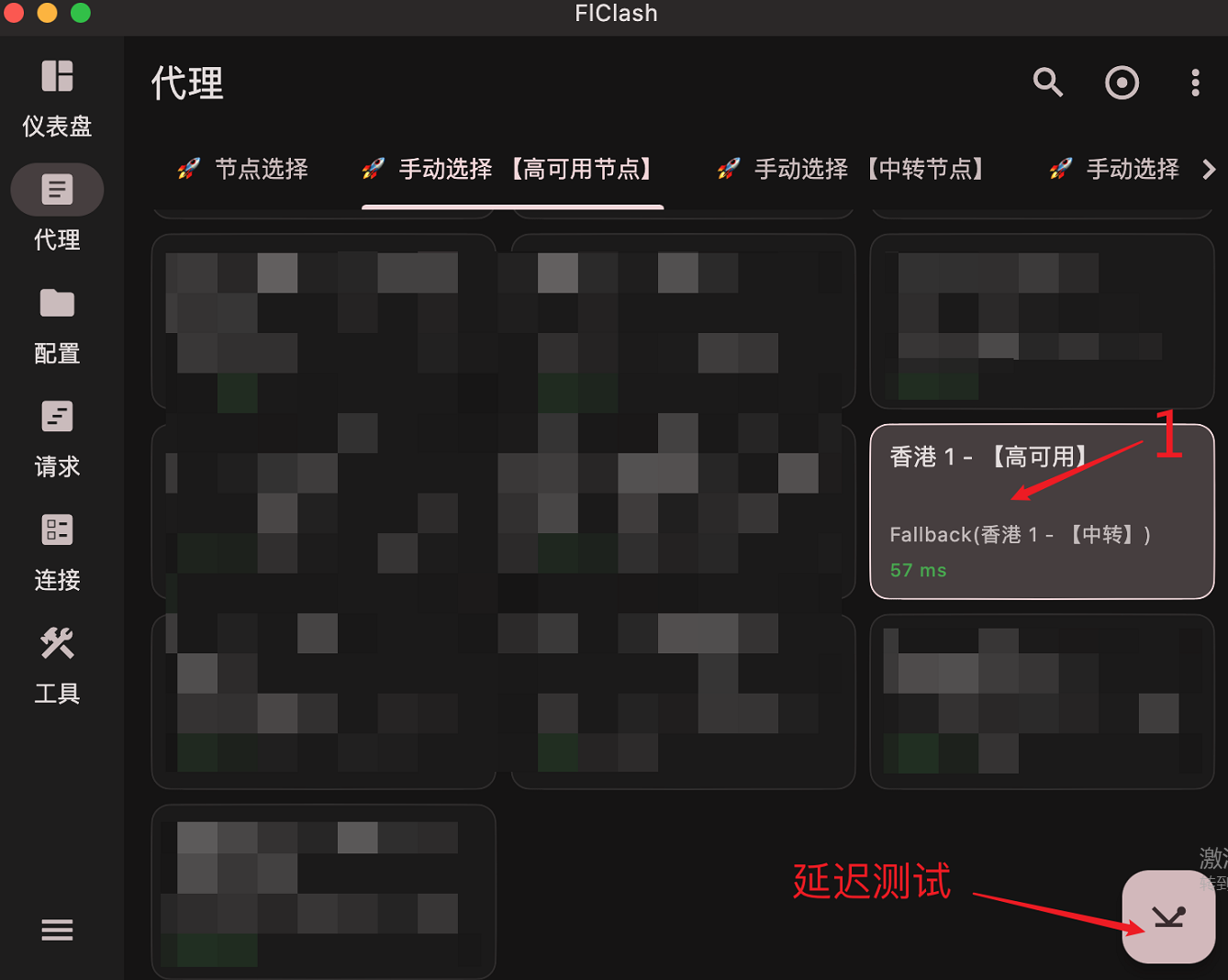 做完上述步骤之后就可以正常使用了,节点选择默认选择自动选择 【高可用节点】,选择自动选择 【高可用节点】之后软件将根据所有【高可用节点】选择延迟最低的作为节点使用,其他自动选择 【XX节点】效果类似