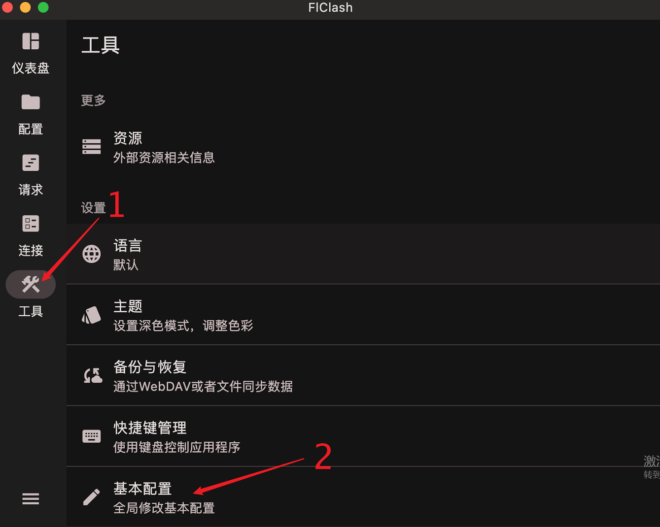 在FlClash软件的主界面,点击工具卡片,然后点击基本配置