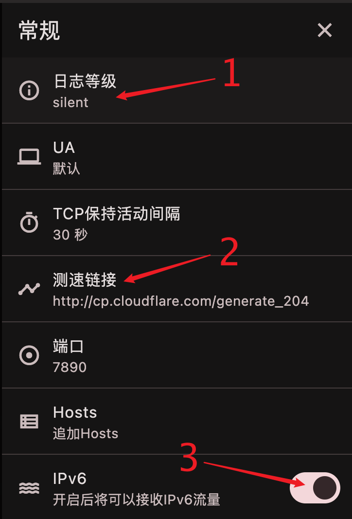 修改日志等级和测速链接的默认参数,并开启IPv6
