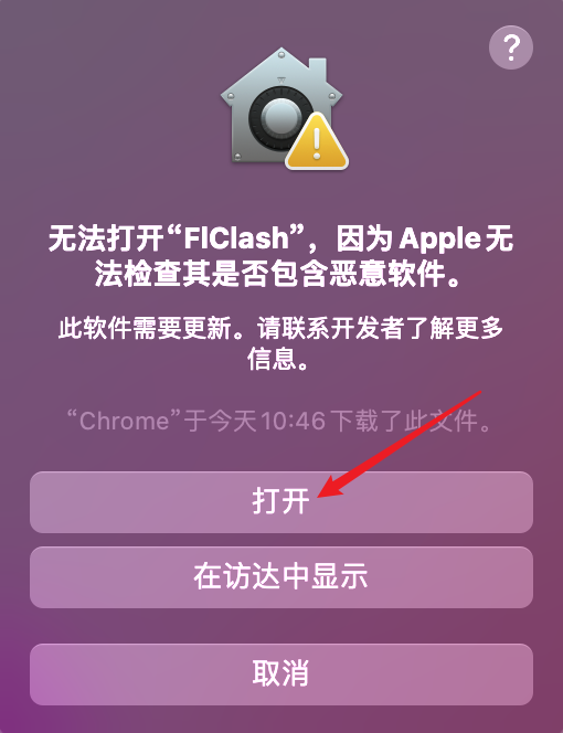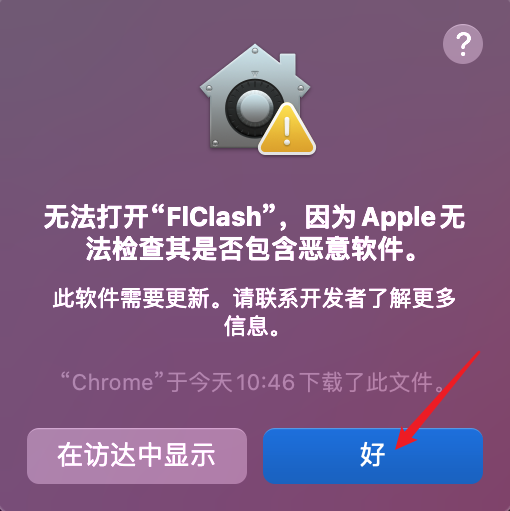 在启动台找到并启动FlClash,双击后可能会出现如下提示,点击好,然后打开系统偏好设置