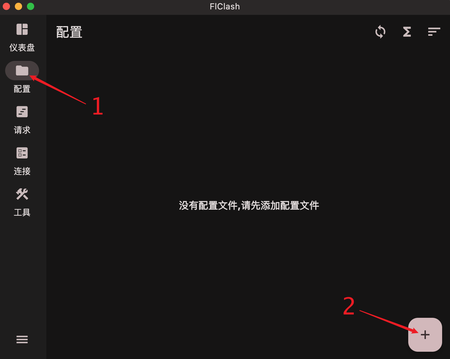 在FlClash软件的主界面,点击配置卡片,然后点击➕按钮