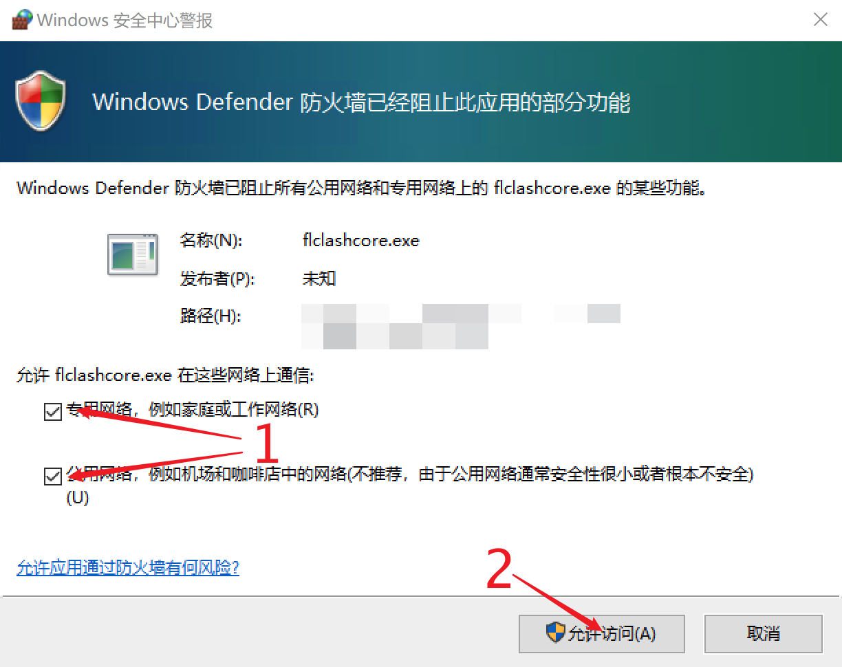 启动后可能会出现如下提示,专用网络和公用网络都打开,然后点击允许访问