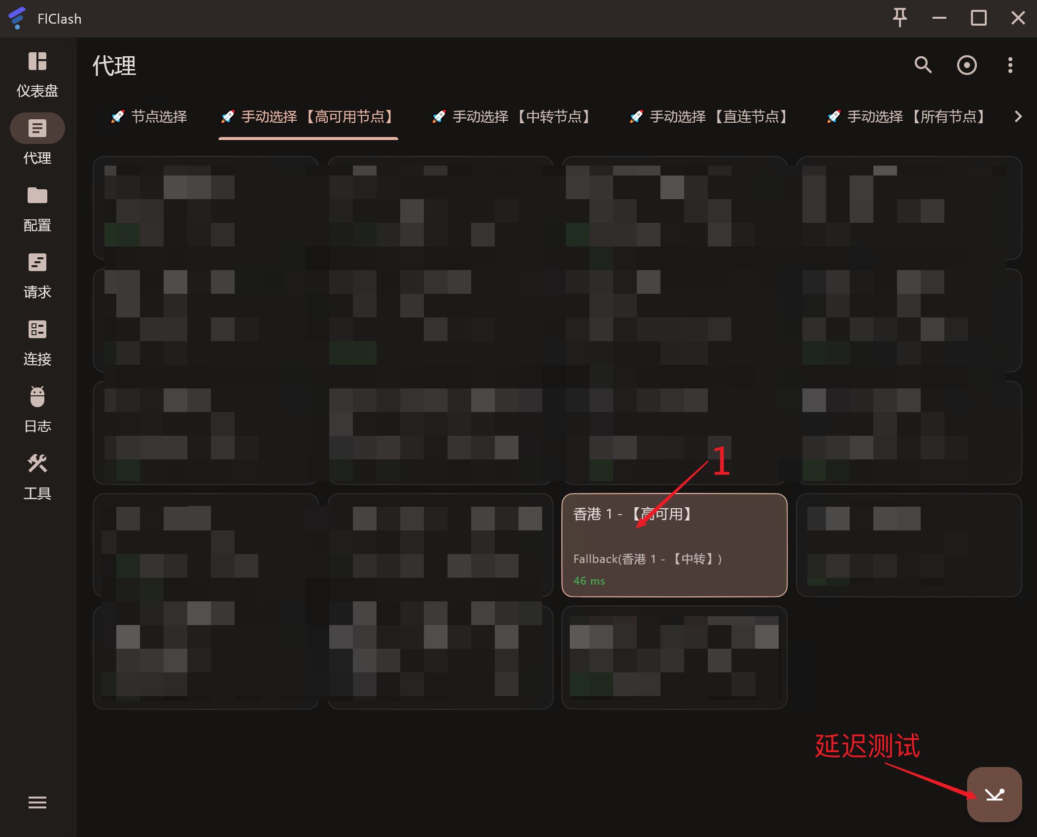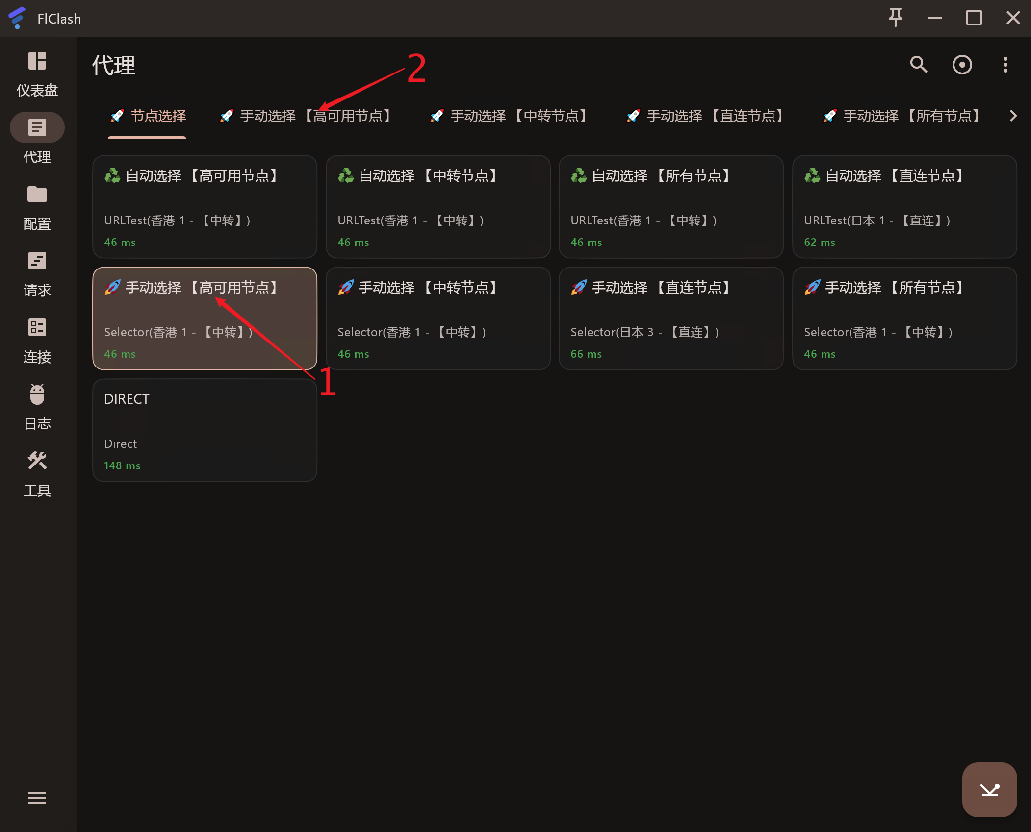 如果想要固定使用某节点,需要先在节点选择中选择手动选择 【XX节点】, 这里以手动选择 【高可用节点】为例