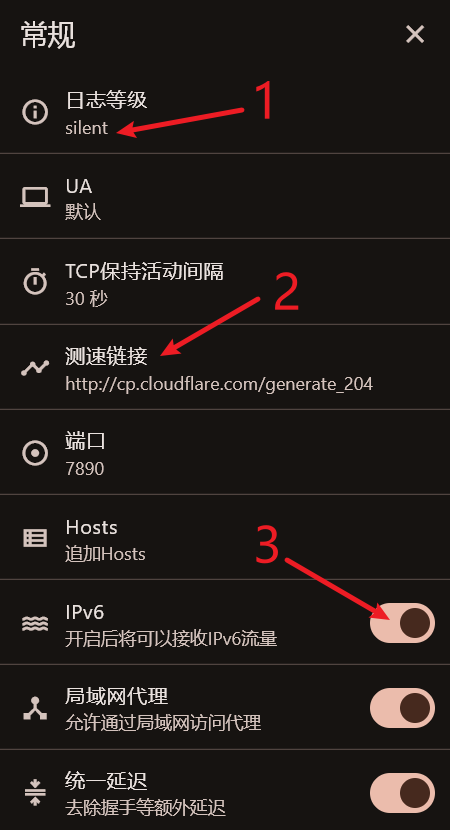 修改日志等级和测速链接的默认参数,并开启IPv6